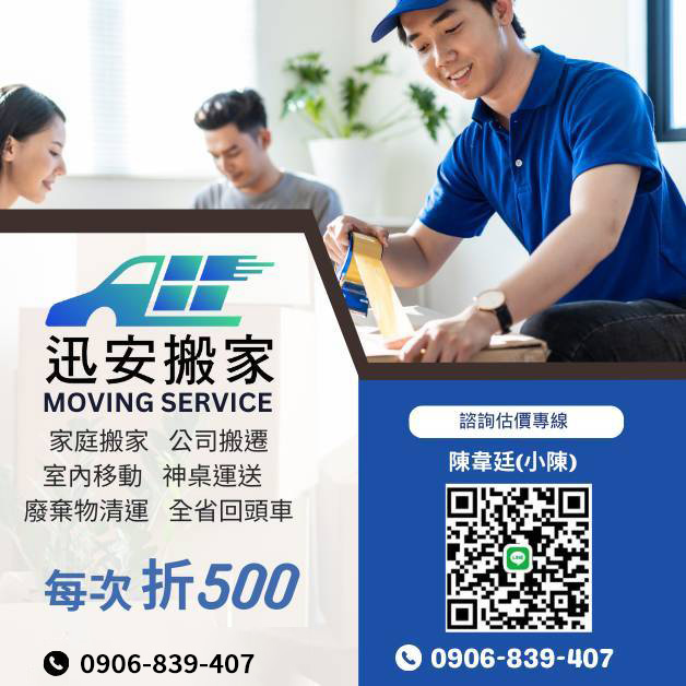 新北陳小姐 搬家當天帥氣親切的師傅們準時到達家裡,細心的包裝搬運,超過2M高度不能從B1搬運勞煩師傅們走大門口,非常感謝他們!平實收費、車況良好,下回搬家一定還是找迅安囉! 桃園蕭太太 找迅安是我最好的一次搬家經驗,因爲有小寶寶東西特別多,師傅們很盡力幫我搬,而且傢俱包裝保護的很好,師傅搬運也非常專業,很厲害一個人搬超大的木製書櫃,再搬家一定只找迅安。 台北王先生 因家中大整修,大部分家具必須搬出再搬進。配合度高、打包仔細。苦力活,接待客戶很客氣,衷心感謝! 桃園林先生 許多家具仍然耐用但尺寸不合,迅安不僅協助搬運,還幫我們清運舊的家具,讓搬家過程省事很多,真的很棒! 【 服務一次到位,搬家最便利 】迅安承諾,讓搬家更安心我們深知搬家不只是物品的移動,更是生活的延續。